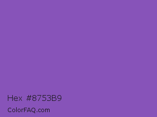 Hex #8753b9 Color is a normal purple color and the nearest color is Fuchsia Blue #7a58c1. Hex code #8753b9 and RGB value is rgb(135,83,185). In RGB color space, this color is composed of 53% red, 33% green, 73% blue, In CMYK color space, this color is composed of 27% cyan, 55% magenta, 0% yellow , 27% black , In HSL color space, this color has a hue angle of 271° , 42% saturation and 53% lightness.