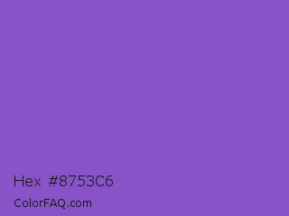 Hex #8753c6 Color is a normal violet color and the nearest color is Fuchsia Blue #7a58c1. Hex code #8753c6 and RGB value is rgb(135,83,198). In RGB color space, this color is composed of 53% red, 33% green, 78% blue, In CMYK color space, this color is composed of 32% cyan, 58% magenta, 0% yellow , 22% black , In HSL color space, this color has a hue angle of 267° , 50% saturation and 55% lightness.