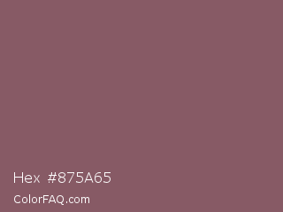 Hex #875a65 Color is a normal red color and the nearest color is Deep Taupe #7e5e60. Hex code #875a65 and RGB value is rgb(135,90,101). In RGB color space, this color is composed of 53% red, 35% green, 40% blue, In CMYK color space, this color is composed of 0% cyan, 33% magenta, 25% yellow , 47% black , In HSL color space, this color has a hue angle of 345° , 20% saturation and 44% lightness.