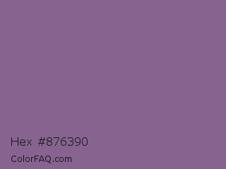 Hex #876390 Color is a normal purple color and the nearest color is French Lilac #86608e. Hex code #876390 and RGB value is rgb(135,99,144). In RGB color space, this color is composed of 53% red, 39% green, 56% blue, In CMYK color space, this color is composed of 6% cyan, 31% magenta, 0% yellow , 44% black , In HSL color space, this color has a hue angle of 288° , 19% saturation and 48% lightness.