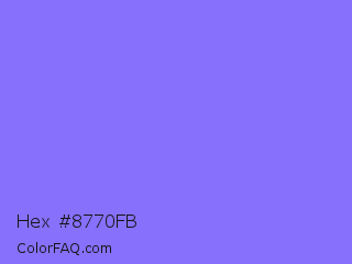 Hex #8770fb Color is a light indigo color and the nearest color is Medium Slate Blue #7b68ee. Hex code #8770fb and RGB value is rgb(135,112,251). In RGB color space, this color is composed of 53% red, 44% green, 98% blue, In CMYK color space, this color is composed of 46% cyan, 55% magenta, 0% yellow , 2% black , In HSL color space, this color has a hue angle of 250° , 95% saturation and 71% lightness.