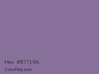Hex #87719a Color is a normal purple color and the nearest color is Trendy Pink #8c6495. Hex code #87719a and RGB value is rgb(135,113,154). In RGB color space, this color is composed of 53% red, 44% green, 60% blue, In CMYK color space, this color is composed of 12% cyan, 27% magenta, 0% yellow , 40% black , In HSL color space, this color has a hue angle of 272° , 17% saturation and 52% lightness.