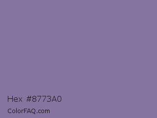 Hex #8773a0 Color is a normal violet color and the nearest color is Rhythm #777696. Hex code #8773a0 and RGB value is rgb(135,115,160). In RGB color space, this color is composed of 53% red, 45% green, 63% blue, In CMYK color space, this color is composed of 16% cyan, 28% magenta, 0% yellow , 37% black , In HSL color space, this color has a hue angle of 267° , 19% saturation and 54% lightness.