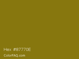 Hex #87770e Color is a dark yellow color and the nearest color is Corn Harvest #8b6b0b. Hex code #87770e and RGB value is rgb(135,119,14). In RGB color space, this color is composed of 53% red, 47% green, 5% blue, In CMYK color space, this color is composed of 0% cyan, 12% magenta, 90% yellow , 47% black , In HSL color space, this color has a hue angle of 52° , 81% saturation and 29% lightness.