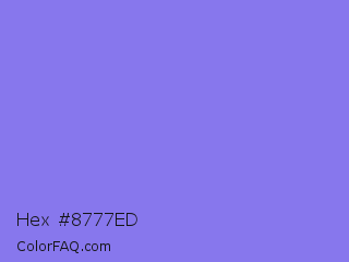 Hex #8777ed Color is a light indigo color and the nearest color is Medium Slate Blue #7b68ee. Hex code #8777ed and RGB value is rgb(135,119,237). In RGB color space, this color is composed of 53% red, 47% green, 93% blue, In CMYK color space, this color is composed of 43% cyan, 50% magenta, 0% yellow , 7% black , In HSL color space, this color has a hue angle of 248° , 77% saturation and 70% lightness.