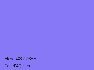 Hex #8778f8 Color is a light indigo color and the nearest color is Medium Slate Blue #7b68ee. Hex code #8778f8 and RGB value is rgb(135,120,248). In RGB color space, this color is composed of 53% red, 47% green, 97% blue, In CMYK color space, this color is composed of 46% cyan, 52% magenta, 0% yellow , 3% black , In HSL color space, this color has a hue angle of 247° , 90% saturation and 72% lightness.