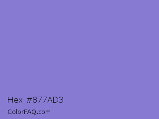 Hex #877ad3 Color is a light indigo color and the nearest color is True V #8a73d6. Hex code #877ad3 and RGB value is rgb(135,122,211). In RGB color space, this color is composed of 53% red, 48% green, 83% blue, In CMYK color space, this color is composed of 36% cyan, 42% magenta, 0% yellow , 17% black , In HSL color space, this color has a hue angle of 249° , 50% saturation and 65% lightness.