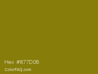 Hex #877d0b Color is a dark yellow color and the nearest color is Olive #808000. Hex code #877d0b and RGB value is rgb(135,125,11). In RGB color space, this color is composed of 53% red, 49% green, 4% blue, In CMYK color space, this color is composed of 0% cyan, 7% magenta, 92% yellow , 47% black , In HSL color space, this color has a hue angle of 55° , 85% saturation and 29% lightness.