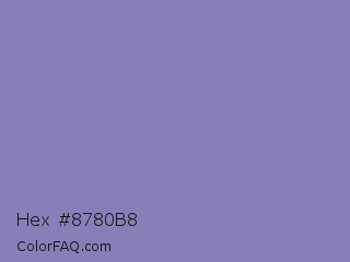 Hex #8780b8 Color is a light indigo color and the nearest color is Ube #8878c3. Hex code #8780b8 and RGB value is rgb(135,128,184). In RGB color space, this color is composed of 53% red, 50% green, 72% blue, In CMYK color space, this color is composed of 27% cyan, 30% magenta, 0% yellow , 28% black , In HSL color space, this color has a hue angle of 248° , 28% saturation and 61% lightness.