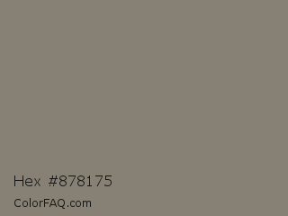 Hex #878175 Color is a normal orange color and the nearest color is Bandicoot #858470. Hex code #878175 and RGB value is rgb(135,129,117). In RGB color space, this color is composed of 53% red, 51% green, 46% blue, In CMYK color space, this color is composed of 0% cyan, 4% magenta, 13% yellow , 47% black , In HSL color space, this color has a hue angle of 40° , 7% saturation and 49% lightness.