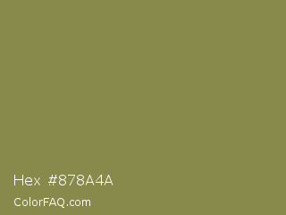 Hex #878a4a Color is a normal yellow color and the nearest color is Dark Tan #918151. Hex code #878a4a and RGB value is rgb(135,138,74). In RGB color space, this color is composed of 53% red, 54% green, 29% blue, In CMYK color space, this color is composed of 2% cyan, 0% magenta, 46% yellow , 46% black , In HSL color space, this color has a hue angle of 63° , 30% saturation and 42% lightness.
