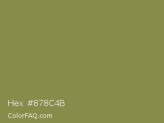 Hex #878c4b Color is a normal yellow color and the nearest color is Dark Tan #918151. Hex code #878c4b and RGB value is rgb(135,140,75). In RGB color space, this color is composed of 53% red, 55% green, 29% blue, In CMYK color space, this color is composed of 4% cyan, 0% magenta, 46% yellow , 45% black , In HSL color space, this color has a hue angle of 65° , 30% saturation and 42% lightness.