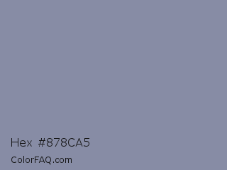 Hex #878ca5 Color is a normal blue color and the nearest color is Manatee Crayola #8d90a1. Hex code #878ca5 and RGB value is rgb(135,140,165). In RGB color space, this color is composed of 53% red, 55% green, 65% blue, In CMYK color space, this color is composed of 18% cyan, 15% magenta, 0% yellow , 35% black , In HSL color space, this color has a hue angle of 230° , 14% saturation and 59% lightness.