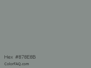 Hex #878e8b Color is a normal green color and the nearest color is Stack #8a8f8a. Hex code #878e8b and RGB value is rgb(135,142,139). In RGB color space, this color is composed of 53% red, 56% green, 55% blue, In CMYK color space, this color is composed of 5% cyan, 0% magenta, 2% yellow , 44% black , In HSL color space, this color has a hue angle of 154° , 3% saturation and 54% lightness.