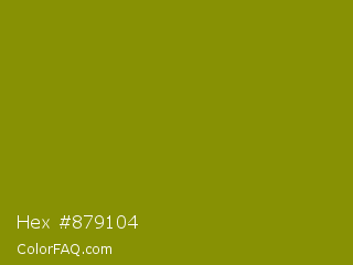 Hex #879104 Color is a dark yellow color and the nearest color is Olive #808000. Hex code #879104 and RGB value is rgb(135,145,4). In RGB color space, this color is composed of 53% red, 57% green, 2% blue, In CMYK color space, this color is composed of 7% cyan, 0% magenta, 97% yellow , 43% black , In HSL color space, this color has a hue angle of 64° , 95% saturation and 29% lightness.
