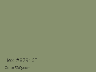 Hex #87916e Color is a normal lime color and the nearest color is Battleship Gray #828f72. Hex code #87916e and RGB value is rgb(135,145,110). In RGB color space, this color is composed of 53% red, 57% green, 43% blue, In CMYK color space, this color is composed of 7% cyan, 0% magenta, 24% yellow , 43% black , In HSL color space, this color has a hue angle of 77° , 14% saturation and 50% lightness.