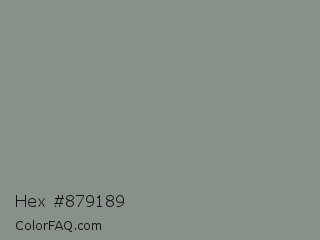 Hex #879189 Color is a normal green color and the nearest color is Stack #8a8f8a. Hex code #879189 and RGB value is rgb(135,145,137). In RGB color space, this color is composed of 53% red, 57% green, 54% blue, In CMYK color space, this color is composed of 7% cyan, 0% magenta, 6% yellow , 43% black , In HSL color space, this color has a hue angle of 132° , 4% saturation and 55% lightness.