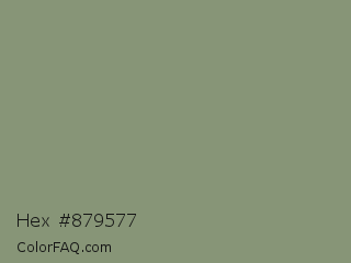 Hex #879577 Color is a normal green color and the nearest color is Artichoke #8f9779. Hex code #879577 and RGB value is rgb(135,149,119). In RGB color space, this color is composed of 53% red, 58% green, 47% blue, In CMYK color space, this color is composed of 9% cyan, 0% magenta, 20% yellow , 42% black , In HSL color space, this color has a hue angle of 88° , 12% saturation and 53% lightness.