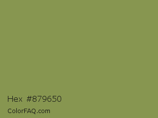 Hex #879650 Color is a normal lime color and the nearest color is Moss Green #8a9a5b. Hex code #879650 and RGB value is rgb(135,150,80). In RGB color space, this color is composed of 53% red, 59% green, 31% blue, In CMYK color space, this color is composed of 10% cyan, 0% magenta, 47% yellow , 41% black , In HSL color space, this color has a hue angle of 73° , 30% saturation and 45% lightness.