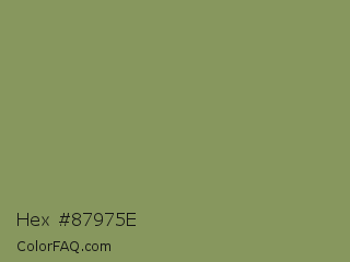 Hex #87975e Color is a normal lime color and the nearest color is Moss Green #8a9a5b. Hex code #87975e and RGB value is rgb(135,151,94). In RGB color space, this color is composed of 53% red, 59% green, 37% blue, In CMYK color space, this color is composed of 11% cyan, 0% magenta, 38% yellow , 41% black , In HSL color space, this color has a hue angle of 77° , 23% saturation and 48% lightness.