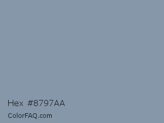 Hex #8797aa Color is a normal blue color and the nearest color is Cool Grey #8c92ac. Hex code #8797aa and RGB value is rgb(135,151,170). In RGB color space, this color is composed of 53% red, 59% green, 67% blue, In CMYK color space, this color is composed of 21% cyan, 11% magenta, 0% yellow , 33% black , In HSL color space, this color has a hue angle of 213° , 17% saturation and 60% lightness.