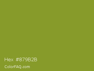 Hex #879b2b Color is a normal lime color and the nearest color is Sushi #87ab39. Hex code #879b2b and RGB value is rgb(135,155,43). In RGB color space, this color is composed of 53% red, 61% green, 17% blue, In CMYK color space, this color is composed of 13% cyan, 0% magenta, 72% yellow , 39% black , In HSL color space, this color has a hue angle of 71° , 57% saturation and 39% lightness.
