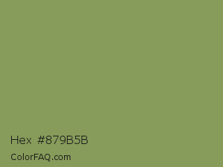 Hex #879b5b Color is a normal lime color and the nearest color is Moss Green #8a9a5b. Hex code #879b5b and RGB value is rgb(135,155,91). In RGB color space, this color is composed of 53% red, 61% green, 36% blue, In CMYK color space, this color is composed of 13% cyan, 0% magenta, 41% yellow , 39% black , In HSL color space, this color has a hue angle of 79° , 26% saturation and 48% lightness.