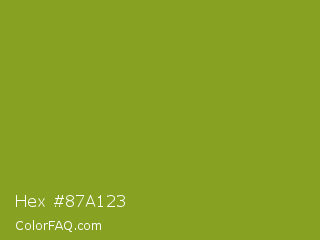 Hex #87a123 Color is a normal lime color and the nearest color is Sushi #87ab39. Hex code #87a123 and RGB value is rgb(135,161,35). In RGB color space, this color is composed of 53% red, 63% green, 14% blue, In CMYK color space, this color is composed of 16% cyan, 0% magenta, 78% yellow , 37% black , In HSL color space, this color has a hue angle of 72° , 64% saturation and 38% lightness.