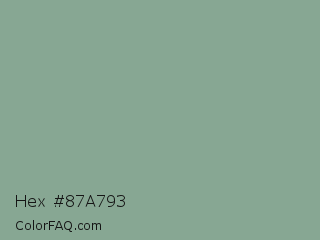 Hex #87a793 Color is a normal green color and the nearest color is Envy #8ba690. Hex code #87a793 and RGB value is rgb(135,167,147). In RGB color space, this color is composed of 53% red, 65% green, 58% blue, In CMYK color space, this color is composed of 19% cyan, 0% magenta, 12% yellow , 35% black , In HSL color space, this color has a hue angle of 143° , 15% saturation and 59% lightness.