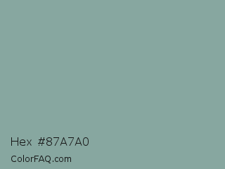 Hex #87a7a0 Color is a normal cyan color and the nearest color is Cascade #8ba9a5. Hex code #87a7a0 and RGB value is rgb(135,167,160). In RGB color space, this color is composed of 53% red, 65% green, 63% blue, In CMYK color space, this color is composed of 19% cyan, 0% magenta, 4% yellow , 35% black , In HSL color space, this color has a hue angle of 167° , 15% saturation and 59% lightness.