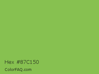 Hex #87c150 Color is a normal green color and the nearest color is Dollar Bill #85bb65. Hex code #87c150 and RGB value is rgb(135,193,80). In RGB color space, this color is composed of 53% red, 76% green, 31% blue, In CMYK color space, this color is composed of 30% cyan, 0% magenta, 59% yellow , 24% black , In HSL color space, this color has a hue angle of 91° , 48% saturation and 54% lightness.