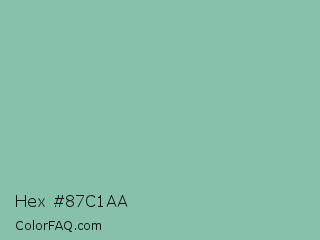 Hex #87c1aa Color is a light green color and the nearest color is Gulf Stream #80b3ae. Hex code #87c1aa and RGB value is rgb(135,193,170). In RGB color space, this color is composed of 53% red, 76% green, 67% blue, In CMYK color space, this color is composed of 30% cyan, 0% magenta, 12% yellow , 24% black , In HSL color space, this color has a hue angle of 156° , 32% saturation and 64% lightness.