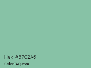 Hex #87c2a6 Color is a light green color and the nearest color is Eton Blue #96c8a2. Hex code #87c2a6 and RGB value is rgb(135,194,166). In RGB color space, this color is composed of 53% red, 76% green, 65% blue, In CMYK color space, this color is composed of 30% cyan, 0% magenta, 14% yellow , 24% black , In HSL color space, this color has a hue angle of 152° , 33% saturation and 65% lightness.