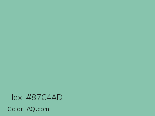 Hex #87c4ad Color is a light green color and the nearest color is Summer Green #96bbab. Hex code #87c4ad and RGB value is rgb(135,196,173). In RGB color space, this color is composed of 53% red, 77% green, 68% blue, In CMYK color space, this color is composed of 31% cyan, 0% magenta, 12% yellow , 23% black , In HSL color space, this color has a hue angle of 157° , 34% saturation and 65% lightness.