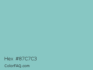 Hex #87c7c3 Color is a light cyan color and the nearest color is Half Baked #85c4cc. Hex code #87c7c3 and RGB value is rgb(135,199,195). In RGB color space, this color is composed of 53% red, 78% green, 76% blue, In CMYK color space, this color is composed of 32% cyan, 0% magenta, 2% yellow , 22% black , In HSL color space, this color has a hue angle of 176° , 36% saturation and 65% lightness.