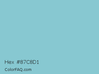 Hex #87c8d1 Color is a light cyan color and the nearest color is Half Baked #85c4cc. Hex code #87c8d1 and RGB value is rgb(135,200,209). In RGB color space, this color is composed of 53% red, 78% green, 82% blue, In CMYK color space, this color is composed of 35% cyan, 4% magenta, 0% yellow , 18% black , In HSL color space, this color has a hue angle of 187° , 45% saturation and 67% lightness.