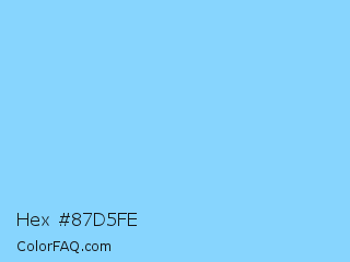 Hex #87d5fe Color is a light blue color and the nearest color is Pale Cyan #87d3f8. Hex code #87d5fe and RGB value is rgb(135,213,254). In RGB color space, this color is composed of 53% red, 84% green, 100% blue, In CMYK color space, this color is composed of 47% cyan, 16% magenta, 0% yellow , 0% black , In HSL color space, this color has a hue angle of 201° , 98% saturation and 76% lightness.