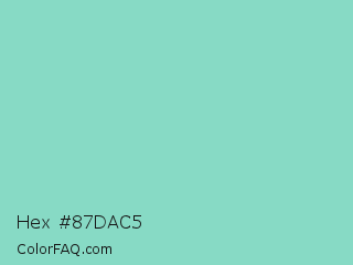 Hex #87dac5 Color is a light cyan color and the nearest color is Pearl Aqua #88d8c0. Hex code #87dac5 and RGB value is rgb(135,218,197). In RGB color space, this color is composed of 53% red, 85% green, 77% blue, In CMYK color space, this color is composed of 38% cyan, 0% magenta, 10% yellow , 15% black , In HSL color space, this color has a hue angle of 165° , 53% saturation and 69% lightness.