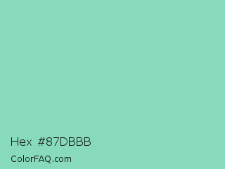 Hex #87dbbb Color is a light green color and the nearest color is Pearl Aqua #88d8c0. Hex code #87dbbb and RGB value is rgb(135,219,187). In RGB color space, this color is composed of 53% red, 86% green, 73% blue, In CMYK color space, this color is composed of 38% cyan, 0% magenta, 15% yellow , 14% black , In HSL color space, this color has a hue angle of 157° , 54% saturation and 69% lightness.