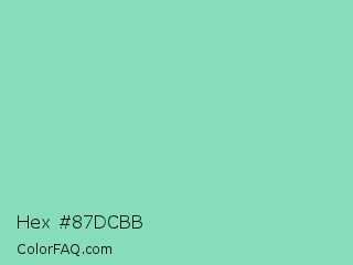 Hex #87dcbb Color is a light green color and the nearest color is Pearl Aqua #88d8c0. Hex code #87dcbb and RGB value is rgb(135,220,187). In RGB color space, this color is composed of 53% red, 86% green, 73% blue, In CMYK color space, this color is composed of 39% cyan, 0% magenta, 15% yellow , 14% black , In HSL color space, this color has a hue angle of 157° , 55% saturation and 70% lightness.