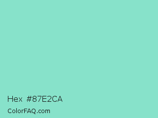 Hex #87e2ca Color is a light cyan color and the nearest color is Middle Blue Green #8dd9cc. Hex code #87e2ca and RGB value is rgb(135,226,202). In RGB color space, this color is composed of 53% red, 89% green, 79% blue, In CMYK color space, this color is composed of 40% cyan, 0% magenta, 11% yellow , 11% black , In HSL color space, this color has a hue angle of 164° , 61% saturation and 71% lightness.