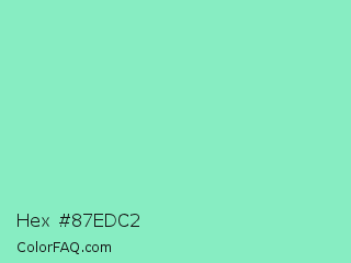 Hex #87edc2 Color is a light green color and the nearest color is Algae Green #93dfb8. Hex code #87edc2 and RGB value is rgb(135,237,194). In RGB color space, this color is composed of 53% red, 93% green, 76% blue, In CMYK color space, this color is composed of 43% cyan, 0% magenta, 18% yellow , 7% black , In HSL color space, this color has a hue angle of 155° , 74% saturation and 73% lightness.