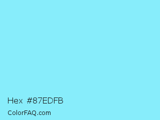 Hex #87edfb Color is a light cyan color and the nearest color is Electric Blue #7df9ff. Hex code #87edfb and RGB value is rgb(135,237,251). In RGB color space, this color is composed of 53% red, 93% green, 98% blue, In CMYK color space, this color is composed of 46% cyan, 6% magenta, 0% yellow , 2% black , In HSL color space, this color has a hue angle of 187° , 94% saturation and 76% lightness.