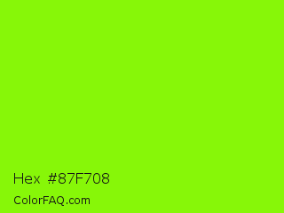 Hex #87f708 Color is a normal green color and the nearest color is Chartreuse #7fff00. Hex code #87f708 and RGB value is rgb(135,247,8). In RGB color space, this color is composed of 53% red, 97% green, 3% blue, In CMYK color space, this color is composed of 45% cyan, 0% magenta, 97% yellow , 3% black , In HSL color space, this color has a hue angle of 88° , 94% saturation and 50% lightness.