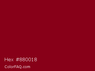 Hex #880018 Color is a dark red color and the nearest color is Red Devil #860111. Hex code #880018 and RGB value is rgb(136,0,24). In RGB color space, this color is composed of 53% red, 0% green, 9% blue, In CMYK color space, this color is composed of 0% cyan, 100% magenta, 82% yellow , 47% black , In HSL color space, this color has a hue angle of 349° , 100% saturation and 27% lightness.