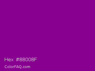 Hex #88008f Color is a dark magenta color and the nearest color is Dark Magenta #8b008b. Hex code #88008f and RGB value is rgb(136,0,143). In RGB color space, this color is composed of 53% red, 0% green, 56% blue, In CMYK color space, this color is composed of 5% cyan, 100% magenta, 0% yellow , 44% black , In HSL color space, this color has a hue angle of 297° , 100% saturation and 28% lightness.