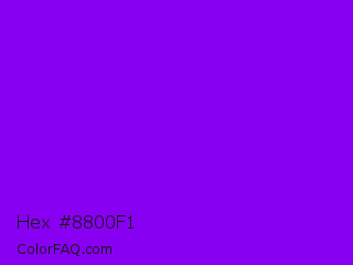 Hex #8800f1 Color is a normal purple color and the nearest color is Electric Violet #8b00ff. Hex code #8800f1 and RGB value is rgb(136,0,241). In RGB color space, this color is composed of 53% red, 0% green, 95% blue, In CMYK color space, this color is composed of 44% cyan, 100% magenta, 0% yellow , 5% black , In HSL color space, this color has a hue angle of 274° , 100% saturation and 47% lightness.