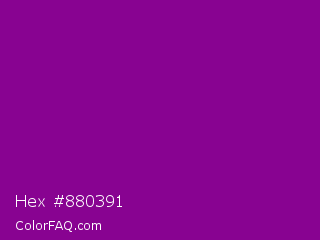 Hex #880391 Color is a dark magenta color and the nearest color is Dark Magenta #8b008b. Hex code #880391 and RGB value is rgb(136,3,145). In RGB color space, this color is composed of 53% red, 1% green, 57% blue, In CMYK color space, this color is composed of 6% cyan, 98% magenta, 0% yellow , 43% black , In HSL color space, this color has a hue angle of 296° , 96% saturation and 29% lightness.
