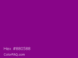 Hex #880588 Color is a dark magenta color and the nearest color is Mardi Gras #880085. Hex code #880588 and RGB value is rgb(136,5,136). In RGB color space, this color is composed of 53% red, 2% green, 53% blue, In CMYK color space, this color is composed of 0% cyan, 96% magenta, 0% yellow , 47% black , In HSL color space, this color has a hue angle of 300° , 93% saturation and 28% lightness.