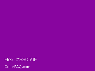 Hex #88059f Color is a normal purple color and the nearest color is Violet RYB #8601af. Hex code #88059f and RGB value is rgb(136,5,159). In RGB color space, this color is composed of 53% red, 2% green, 62% blue, In CMYK color space, this color is composed of 14% cyan, 97% magenta, 0% yellow , 38% black , In HSL color space, this color has a hue angle of 291° , 94% saturation and 32% lightness.